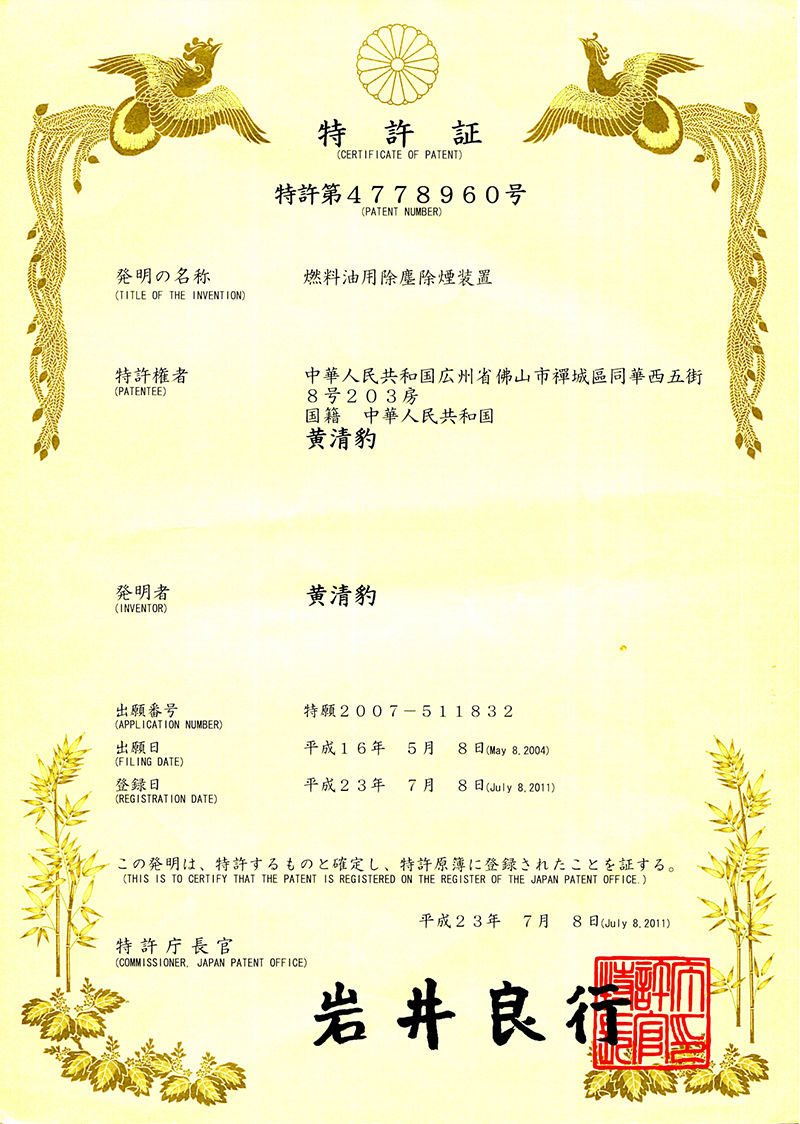 美國專利證書1:一種除燃油煙塵設(shè)備(人居-2011) 日本專利證書2:一種除燃油煙塵設(shè)備(人居-2011)